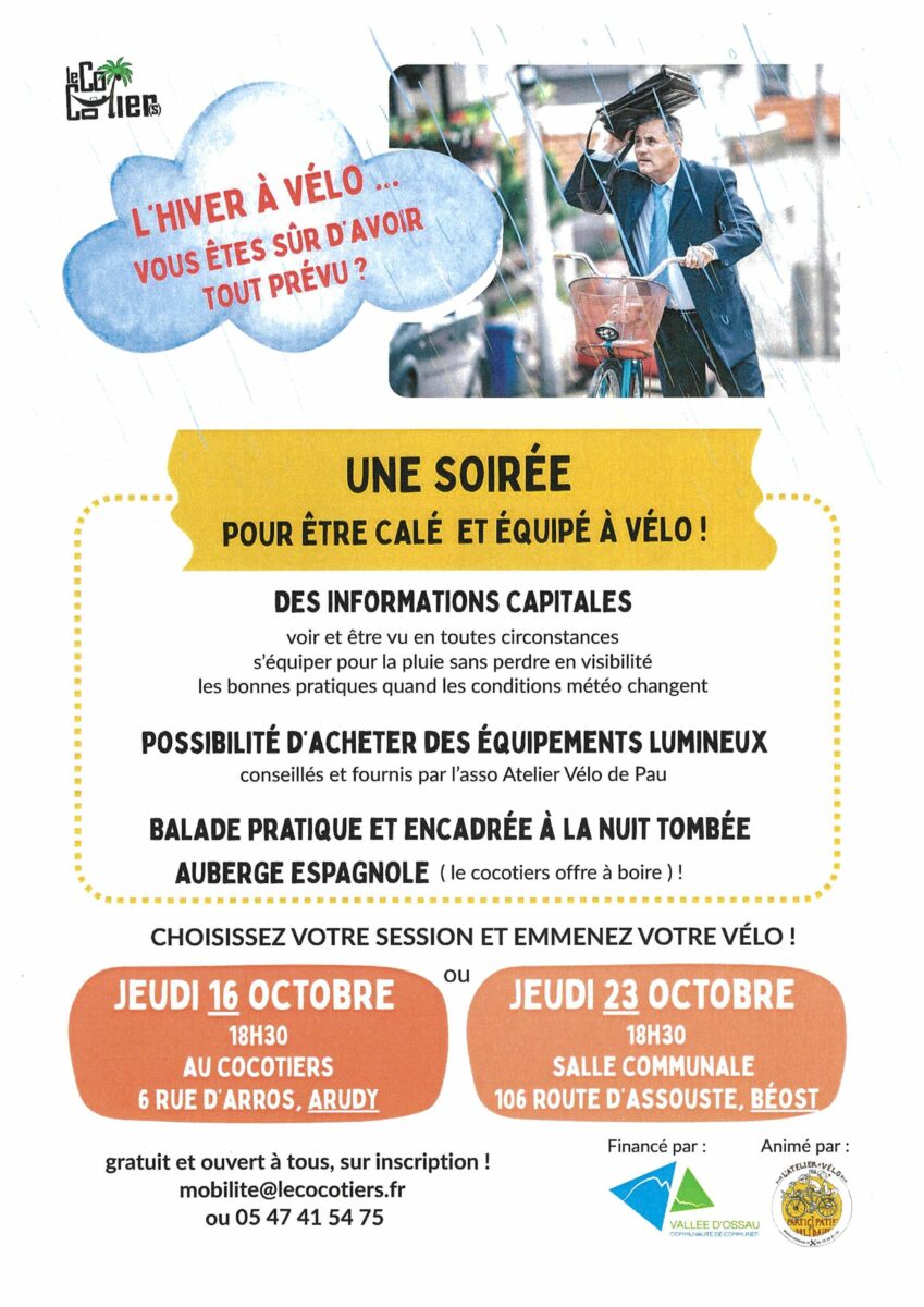 Choisissez votre session en emmenez votre vélo ! Jeudi 16 octobre au Coco'Tiers ou jeudi 23 octobre à la Salle Communale de Béost. Ouvert à tous et à toutes sur inscription à mobilite@lecocotiers.fr