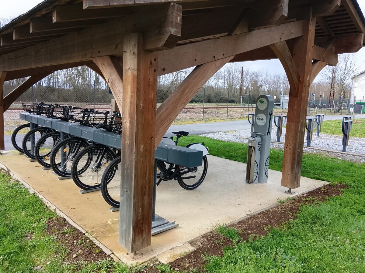 Aire avec borne multifonction comprenant outils de réparation et pompe de gonflage avec manomètre.