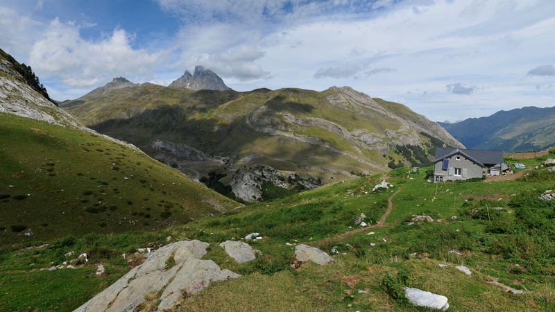 Intersection de sentiers sous le Caillou de Soques (8,7 km / 3h00). Laisser à gauche une passerelle et à droite le chemin du refuge de Pombie, pour continuer en face sur un sentier légèrement ascendant, entre bosquets et pelouses (garder la sente la plus marquée). A la sortie d'un petit bois de buis, on découvre les ruines de la Caze Brousset (1390 m). Continuer sur le chemin ascendant dominant les ruines. Dix minutes plus haut, traverser une prairie par son milieu (cairns) puis, avant d'atteindre le bois de hêtres, veiller à bien monter dans l'herbe à droite, en lisière de bois (hors sentier). Sur la partie haute de la clairière (vers 1490 m), suivre le sentier qui entre dans la forêt à gauche (remarquer un dolmen). Il perdra quelques mètres pour rejoindre une passerelle récente et imposante sur le gave (10,5 km / 3h45). Sur la rive opposée, emprunter le sentier vers la gauche ; il grimpe en courts lacets vers un gros bloc, puis se décale légèrement à main droite pour passer sous la route, qu'il ne tarde pas à rejoindre en amont d'un paravalanches. Monter en bordure de la D934 sur 500 m (prudence). Juste avant le pont en pierre de Peyrelue, quitter le bitume pour le sentier balisé à gauche (direction cabane de Peyrelue). Il s'extirpe d'un bois clair puis prend de la hauteur en courts lacets. A la cabane de Peyrelue (point d'eau), rejoindre le fond de vallée et marcher sur l'une des sentes horizontales en direction du sud. Passant d'une rive à l'autre du ruisselet, l'itinéraire vous rapproche de la frontière. Garder le cap lorsque la vallée s'élargit, pour avancer dans l'herbe (ignorer une cabane en hauteur sur la gauche). Contourner une zone humide par la gauche pour rallier le col frontière de Peyrelue (14,1 km / 5h00), peu marqué (clôture). Une sente prend le relais au milieu des blocs et iris pour descendre sur le versant espagnol.