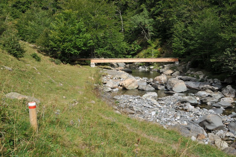 Intersection de sentiers sous le Caillou de Soques (8,7 km / 3h00). Laisser à gauche une passerelle et à droite le chemin du refuge de Pombie, pour continuer en face sur un sentier légèrement ascendant, entre bosquets et pelouses (garder la sente la plus marquée). A la sortie d'un petit bois de buis, on découvre les ruines de la Caze Brousset (1390 m). Continuer sur le chemin ascendant dominant les ruines. Dix minutes plus haut, traverser une prairie par son milieu (cairns) puis, avant d'atteindre le bois de hêtres, veiller à bien monter dans l'herbe à droite, en lisière de bois (hors sentier). Sur la partie haute de la clairière (vers 1490 m), suivre le sentier qui entre dans la forêt à gauche (remarquer un dolmen). Il perdra quelques mètres pour rejoindre une passerelle récente et imposante sur le gave (10,5 km / 3h45). Sur la rive opposée, emprunter le sentier vers la gauche ; il grimpe en courts lacets vers un gros bloc, puis se décale légèrement à main droite pour passer sous la route, qu'il ne tarde pas à rejoindre en amont d'un paravalanches. Monter en bordure de la D934 sur 500 m (prudence). Juste avant le pont en pierre de Peyrelue, quitter le bitume pour le sentier balisé à gauche (direction cabane de Peyrelue). Il s'extirpe d'un bois clair puis prend de la hauteur en courts lacets. A la cabane de Peyrelue (point d'eau), rejoindre le fond de vallée et marcher sur l'une des sentes horizontales en direction du sud. Passant d'une rive à l'autre du ruisselet, l'itinéraire vous rapproche de la frontière. Garder le cap lorsque la vallée s'élargit, pour avancer dans l'herbe (ignorer une cabane en hauteur sur la gauche). Contourner une zone humide par la gauche pour rallier le col frontière de Peyrelue (14,1 km / 5h00), peu marqué (clôture). Une sente prend le relais au milieu des blocs et iris pour descendre sur le versant espagnol.