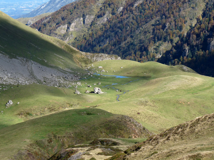 2h00 Passer le Pas de Calhabet, un passage raide dans les rochers que l’on descend. Longer ensuite le bas de la falaise en suivant le chemin le plus marqué. Traverser des zones de pierriers sous le Pic de Lorry.2h30 Au niveau d’un laquet, prendre à gauche. Descendre sur 100m. Au niveau d’une jolie petite source, prendre à droite puis remonter à flanc.3h10 Au col de Barca, descendre dans le vallon de gauche puis suivre sur une croupe en tirant sur ladroite.3h45 À droite, descendre vers le ruisseau puis à gauche. Passer devant la cabane d’Ibech puis remonter sur la piste. Prendre à droite et descendre.
