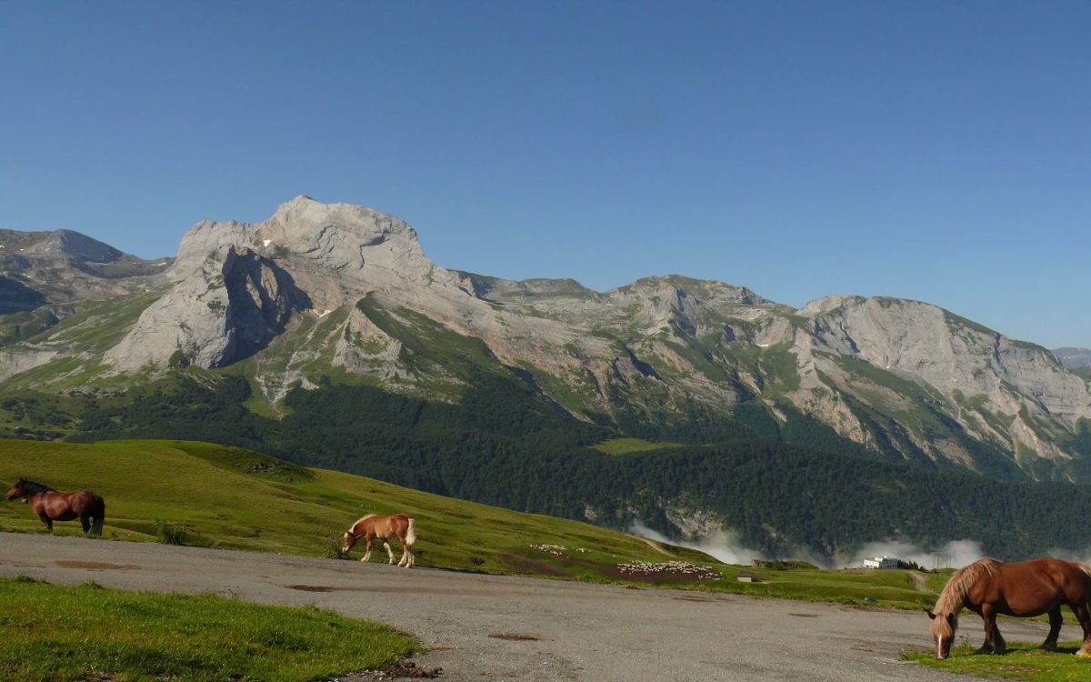 Depuis le parking du col d’Aubisque, laisser les commerces sur votre gauche pour prendre, vers le nord et sur 2400m, la piste empierrée qui domine les paysages du col du Soulor et de la vallée de l’Ouzom. Prendre à droite la piste de terre s’engageant dans le pâturage sur la ligne de crête. Le tracé s’estompe peu à peu, les jalons matérialisant l’axe du passage, toujours sur la ligne de crête pour atteindre le col de Louvie. Attention, des clôtures électriques temporaires peuvent limiter la divagation du bétail. Ouvrez l’œil et pensez à refermer les clôtures grâce à la poignée isolante spécialement prévue pour faciliter le passage. Au col de Louvie, la bifurcation à gauche domine un talweg.