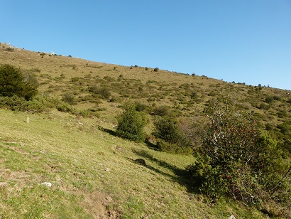 1h30 Du sommet, redescendre par le même chemin jusqu’au col de Marie Blanque. Par beau temps, il est possible, à partir du point 3, de suivre à droite des chemins d’animaux pour rejoindre un petit plateau parsemé d’aubépines. De là, prendre à gauche et suivre à partir d’un abreuvoir la piste jusqu’au Col de Marie Blanque (itinéraire d’environ 1,6 km en pointillé sur la carte et non balisé sur le terrain).