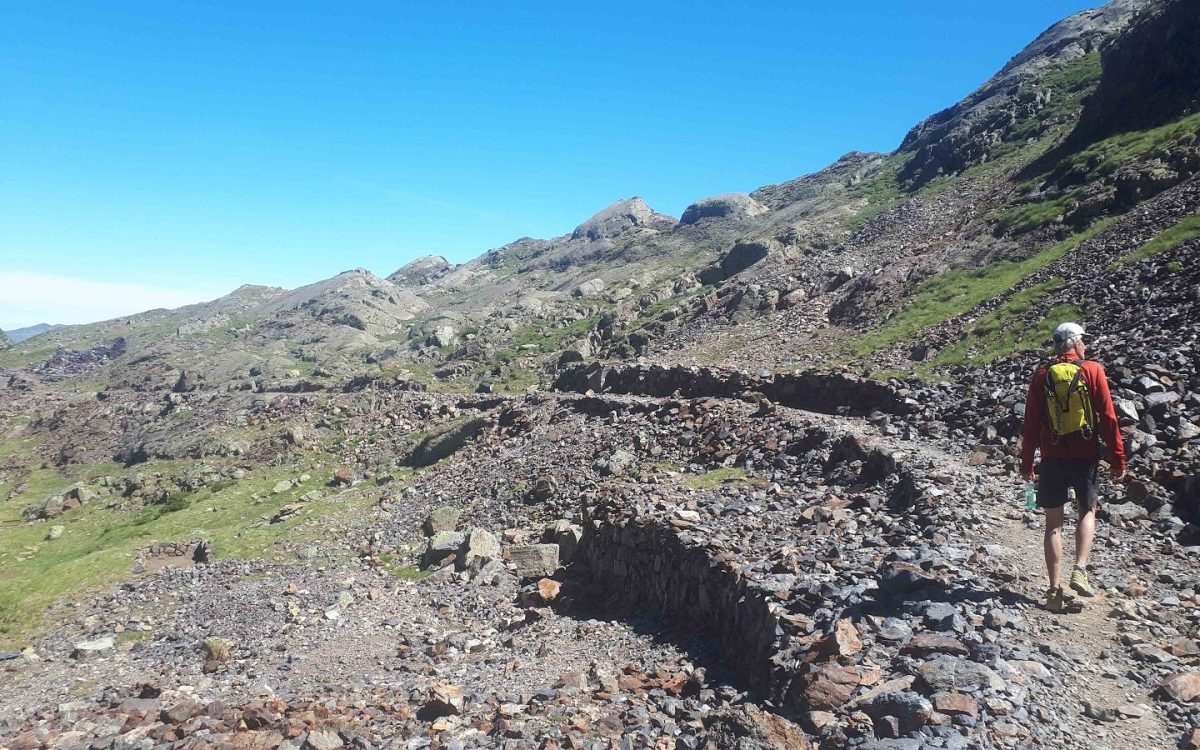 Poursuivre cette crête quelques dizaines de mètres puis descendre à droite en traversée afin d'arriver au lac Supérieur, premier laquet visible depuis la crête. Le longer par la rive droite pour arriver au Lac de Louesque puis au lac Inférieur.Une alternance de courts ressauts et de vallonnements vous amène dans les pentes herbeuses en direction de la cabane de Coste de Goua où nous vous conseillons de redescendre par le GR10. Seconde possibilité, suivre le GR10 jusqu’au Lac d’Anglas en continuant sur le sentier qui monte en lacets en direction du Sud. L’itinéraire contourne le lac par sa gauche en traversant les anciennes mines (de fer – danger fermées au public) qui s’élève à flanc face Sud. Suivre la sente vers le lac d’Uzious et du Lavedan puis suivre la sente ou le sentier sur la montée vers le Col d’Uzious et le Pic du Sanctus.