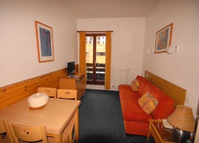 Studio situé au premier étage de la résidence avec vue sur la station. Il est composé d'une pièce à vivre équipée d'un canapé convertible offrant deux couchages. L'alcôve propose un lit superposé offrant deux couchages pour une personne. Le coin cuisine est équipé d'un lave-vaisselle et de tout le nécessaire pour un séjour réussi.
