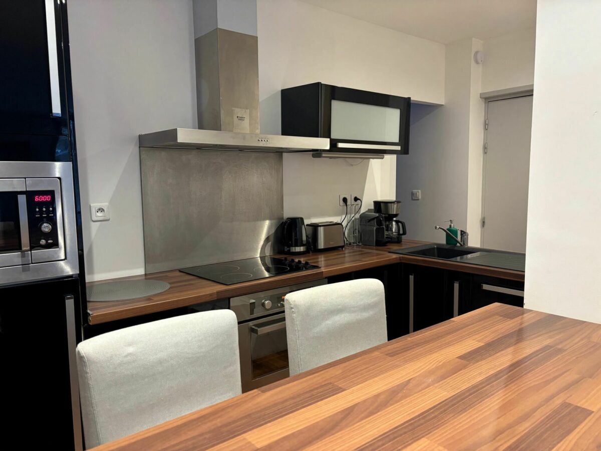 Equipements de l'appartement : Cuisine ouverte avec : Plaque 4 feux vitro – Réfrigérateur – Four traditionnel - Four micro-ondes – Lave-vaisselle - Cafetière filtre et Nespresso - Grille-pain – Bouilloire –Appareil à raclette – Lave- linge