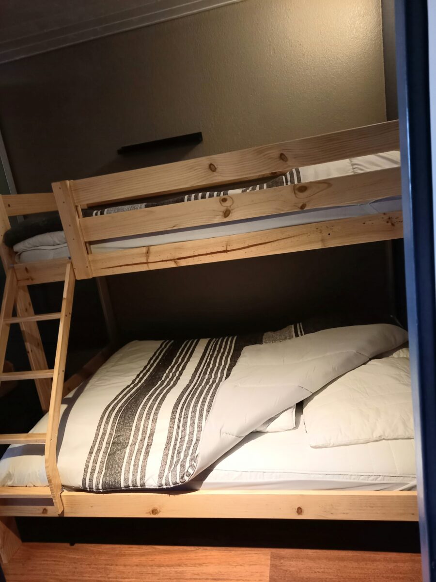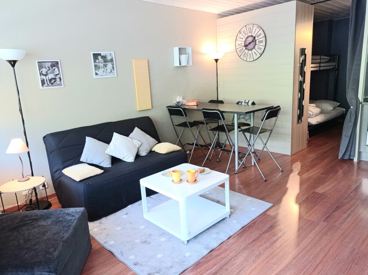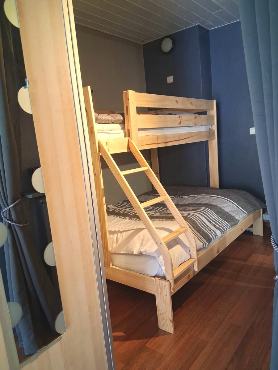 - Dans le couloir d'entrée, vous trouverez une alcôve avec lits superposés neuf en bois 140 x 190 (2pers) et 90 x 190(1pers), une salle d'eau avec douche (sèche serviettes et sèche-cheveux), WC séparés. Le séjour se compose d'un canapé BZ pour 2 personnes (140x190), d'une télévision, d'un coin repas, d'une cuisine équipée avec plaque vitrocéramiques 4 feux, four multifonctions, réfrigérateur/congélateur, micro-ondes, lave-vaisselle, machine NESPRESSO, cafetière avec filtre, bouilloire, grille-pain.Des jeux de sociétés pour enfants et adultes sont disponibles (Scrabble, Trivial Poursuit, jeux de cartes, etc...). Balcon avec table et 4 chaises. Cave à skis.