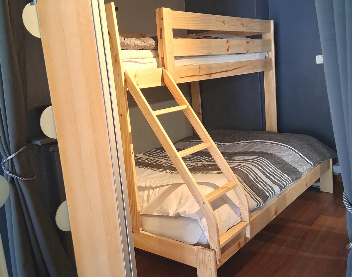 • Dans le couloir d'entrée, vous trouverez une alcôve avec lits superposés neuf en bois 140 x 190 (2pers) et 90 x 190(1pers), une salle d'eau avec douche (sèche serviettes et sèche-cheveux), WC séparés. Le séjour se compose d'un canapé BZ pour 2 personnes (140x190), d'une télévision, d'un coin repas, d'une cuisine équipée avec plaque vitrocéramiques 4 feux, four multifonctions, réfrigérateur/congélateur, micro-ondes, lave-vaisselle, machine NESPRESSO, cafetière avec filtre, bouilloire, grille-pain.Des jeux de sociétés pour enfants et adultes sont disponibles (Scrabble, Trivial Poursuit, jeux de cartes, etc...). Balcon avec table et 4 chaises. Cave à skis.