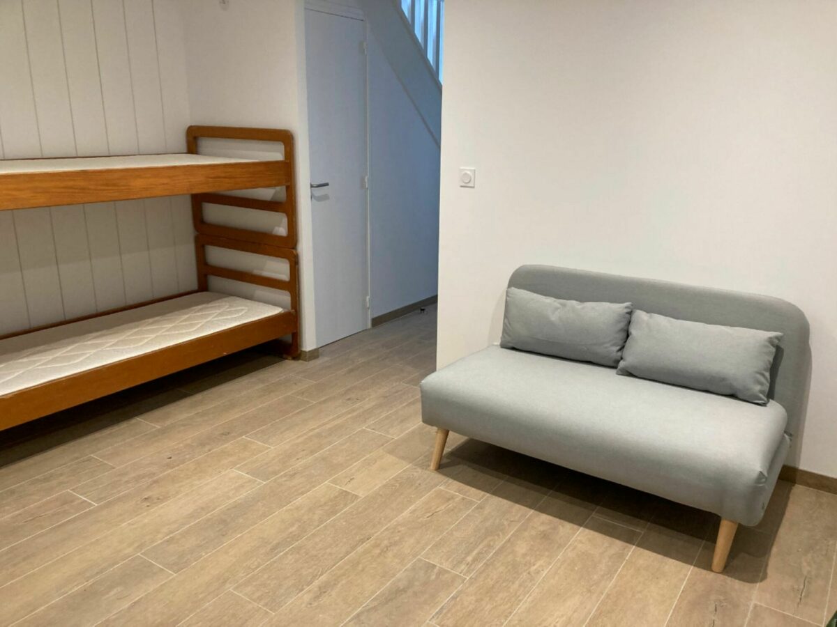 Couchage : Au RDC : 1 Chambre : 2 Lits superposés en 90 et un convertible 1 place