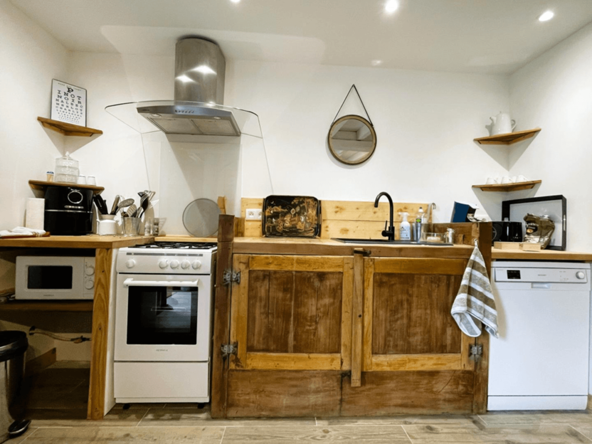 Equipements du Gîte : Cuisine fermée et équipée : Gazinière à gaz 4 – Four - Four micro-ondes - Réfrigérateur avec partie congélateur – Lave-vaisselle – Lave-linge - Cafetière filtre et Senseo - Bouilloire - Grille-pain – Airfryer - Appareil à raclette/pierrade – Mixeur plongeur – Presse agrume
