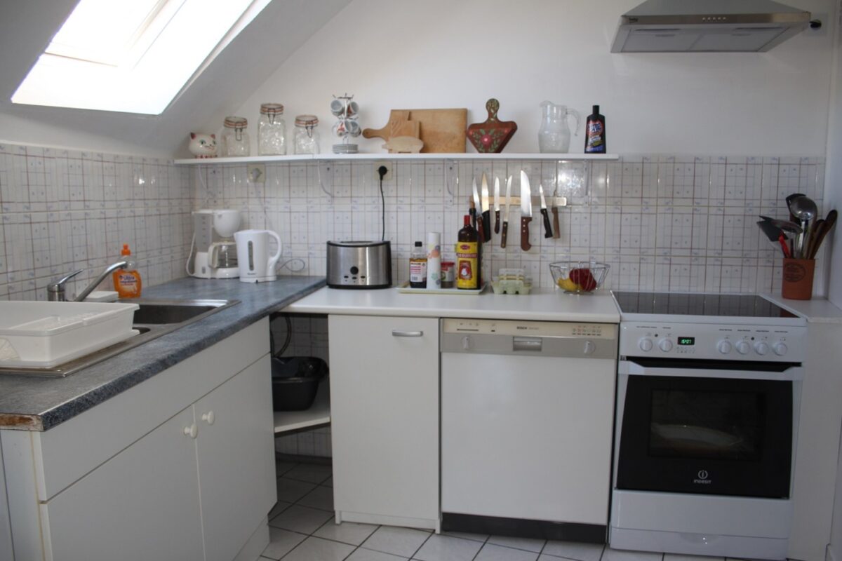 Composé d’un séjour, salon, cuisine fermée, salle de bain et 2 chambres. L’appartement est situé au 1er étage de la maison.