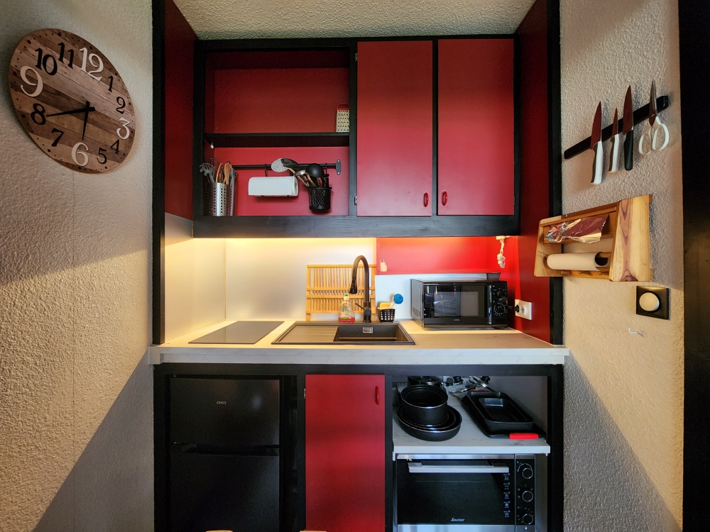 - Studio composé d'une pièce à vivre avec 1 convertible, 4 lits superposés dans l'entrée, 1 salle d'eau et d'un coin cuisine et d'un balcon orienté est.Couchage : Alcôve : 4 lits superposés - Pièce principale : 1 Convertible 2 placesOreillers, couvertures et couettes à dispositionChauffage : ElectriqueSanitaire : Douche et WC – Sèche-cheveuxEquipements du studio : Plaque de cuisson 2 feux – Réfrigérateur avec partie congélateur – Four - Micro-ondes - Appareil à raclette/pierrade – Appareil à fondue - Cafetière Senseo– Grille-pain – Bouilloire – Grill électrique – Lave-linge - Télévision Equipements extérieurs : Balcon/Terrasse avec salon de jardin - Stationnement privéPrestation : Possibilité de location de draps et linge de toilette : Devis sur demande - Possibilité de location de matériel enfant - Possibilité de forfait ménage : 60 €Le prix de la location comprend : l’hébergement, les charges Le prix de la location ne comprend pas : les frais de dossier (20€), la caution (400 €) restituée après état des lieux lors de votre départ, la caution ménage : 60 € restituée après état des lieux, le linge de maison et la taxe de séjour
