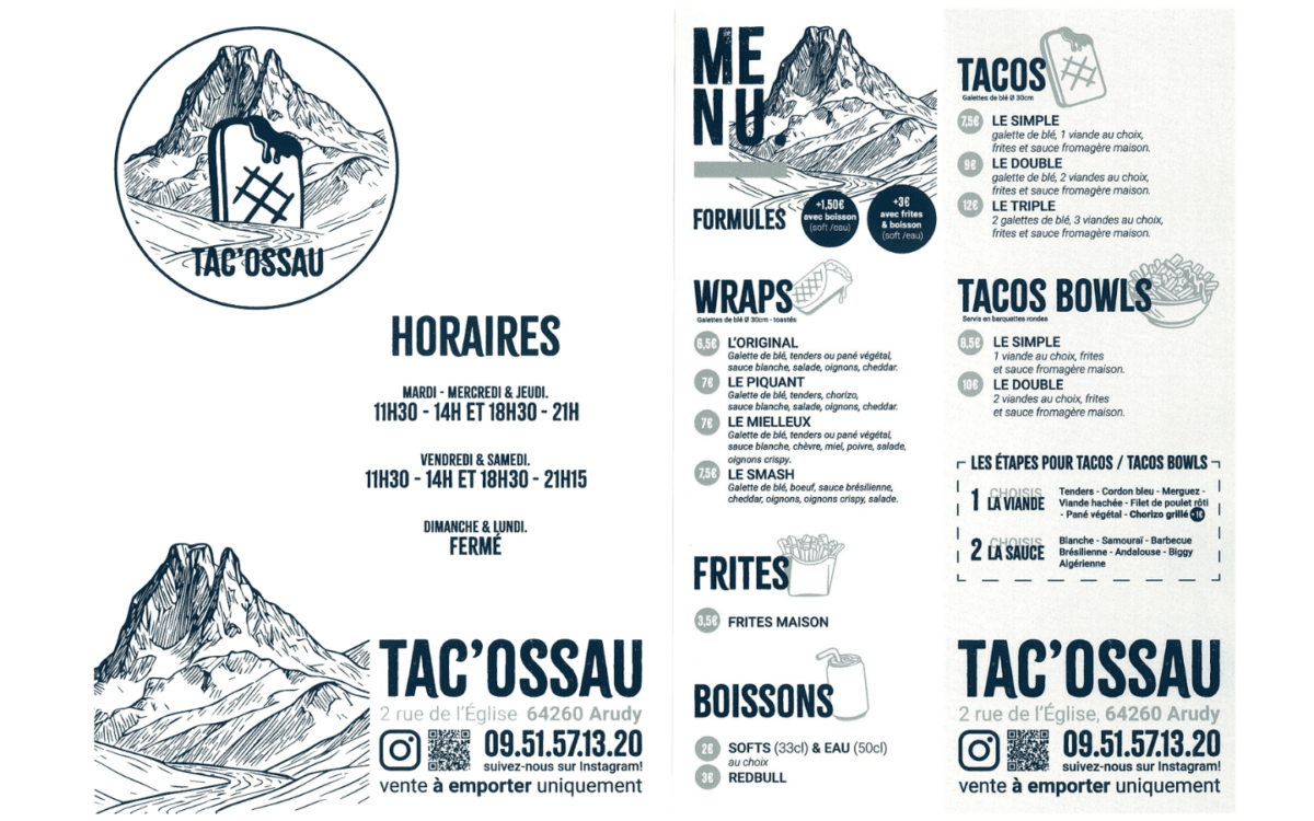 Restauration rapide uniquement à emporter, boissons soft uniquement. Préparation sur place de French Tacos et Wrap avec des produits locaux.
